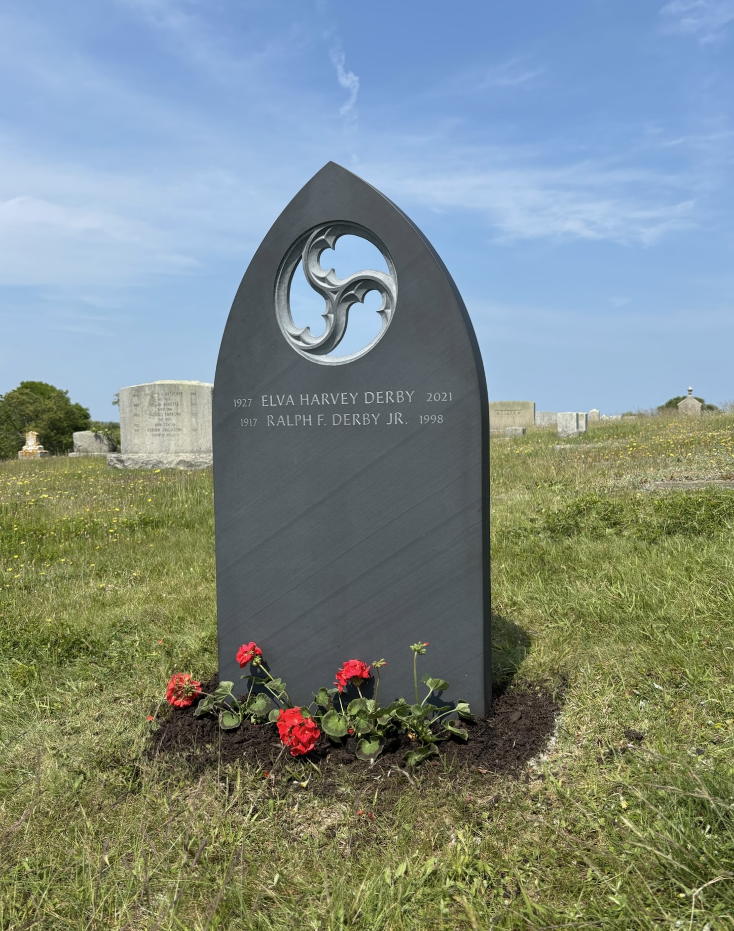 This shared memorial commemorates those whose ashes are scattered on and around Block Island, RI, or for those with a connection to Block Island who are entombed elsewhere. The triform, through-carved motif was conceived and realized by sculptor Rob Gil, emerging from his fascination with architectural tracery. On each side of the black slate is space for 12 names and dates. I’ve already had the honor of inscribing two names on the stone, those of Elva and Ralph Derby, my beloved caretakers as I was 19 living on the Island.