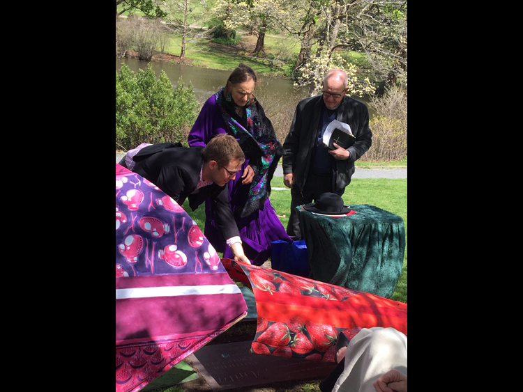 Stories were shared, tears were shed and laughter mixed with bird song as we stood overlooking willow pond under blue sky. Son and daughter unveiled the monument that was covered with Bud’s vibrant, colorful fabrics.