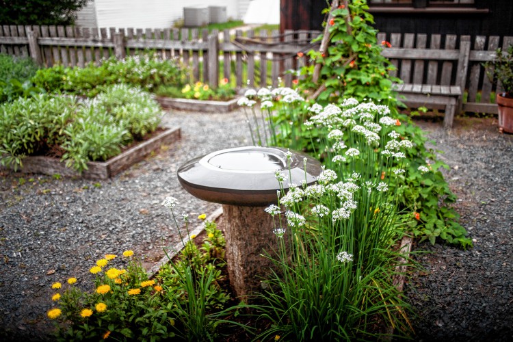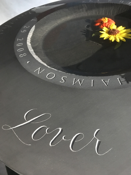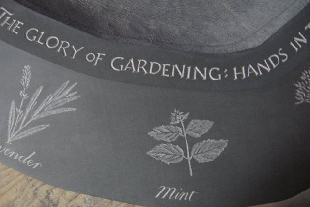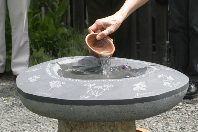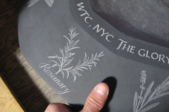 A second call came to my studio from a husband who wanted to remember his wife. She was also killed in the towers and her body never recovered. Together we designed a stone bowl bird bath that rests in an herb garden at the Historic Deerfield Museum. The cooks garden, as it is called, was created in her honor and to remember her love for open hearth cooking. Thirteen herbs are hand carved on the edge of the bowl. Each herb is named so the viewer can identify the herb in the garden. Her name and a poetic verse circle round the inner rim.